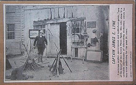 Hunting for Civil War relics began, in some cases, the day after a battle ended. This postcard shows Captain James E. Lyne standing in front of the relic shop where he sells artifacts from the Battle of Seven Pines. He, also, serves as a battlefield guide. Captain Lyne fought in this battle, on the Confederate side. Postcard is circa 1900. Please see note below! ~~~~~~~~~ The great-granddaughter of Captain Lyne has been in touch with me and she would love to hear from anyone who may have information about her great-grandfather or the Virginia regiment where he may have served. If you have any info, please get in touch with Betty. Thank you! |