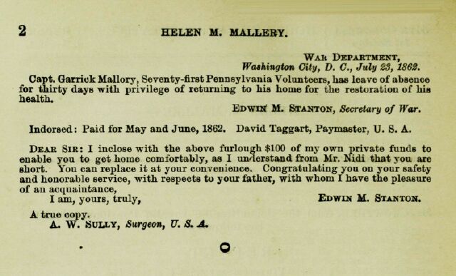 Copy of permission for leave of absence and letter from Edwin M. Stanton, Secretary of War, to Capt. Garrick Mallory (Mallery?) of the 71st Pennsylvania Volunteers; Stanton, who was acquainted with Mallory's father, encloses $100 as a loan to the Captain, to be paid back at his convenience. (I recall copying this from a book a long time ago but, unfortunately, I've lost track of which book it was.) |