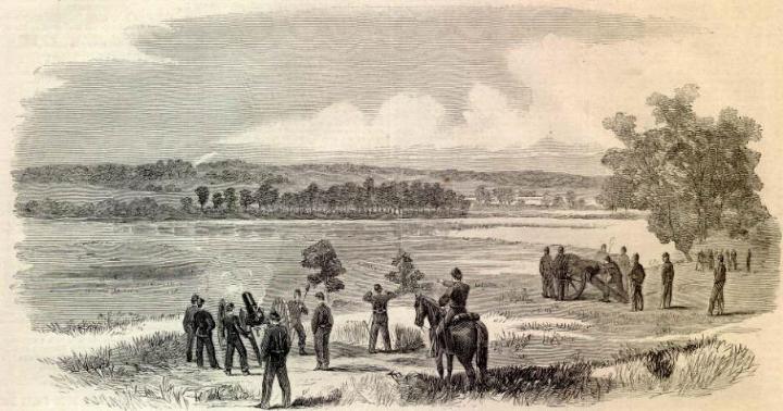 Army of the Potomac, Captain Porter's Massachusetts Battery shelling Confederate positions across the Chickahominy River; sketch from "Harper's Weekly" - June 21, 1862 Issue, by A. R. Waud. "Mr. Waud thus describes it: 'The sketch gives a good idea of the scenery of this stream, flowing through rich, flat meadows and bordered by a fringe of trees -- hills, partly under cultivation and, in part, covered with woods. The Richmond turnpike crosses the stream -- or swamp as the natives call it -- upon a bridge near Mechanicsville, which the Confederates have burned and now guard by artillery placed upon the hill. Along the river, Federal pickets are thickly posted, under cover of trees and bushes or in the open fields.' " From "Harper's Weekly" - June 21, 1862 Issue. |