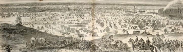 Sketch of the encampment, Army of the Potomac, at Cumberland on the Pamunky River, by Mr. Mead. "This encampment was a very striking scene indeed. Never before in this country had so many men of various armies been collected on one plain. The site of the camp itself was one of great natural beauty. Up the river, numbers of transports, steamers and sailing craft were constantly hurrying forward with troops and munitions of war. The quiet little stream was never so busy since it first flowed downward. It was from this encampment that the army moved forward to the Chickahominy and the Battle of Fair Oaks." From "Harper's Weekly" - June 21, 1862 Issue |