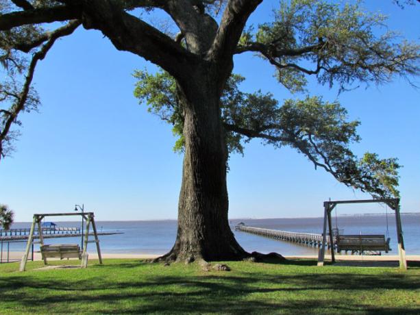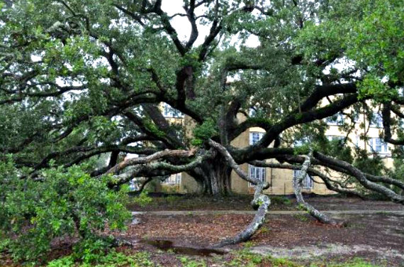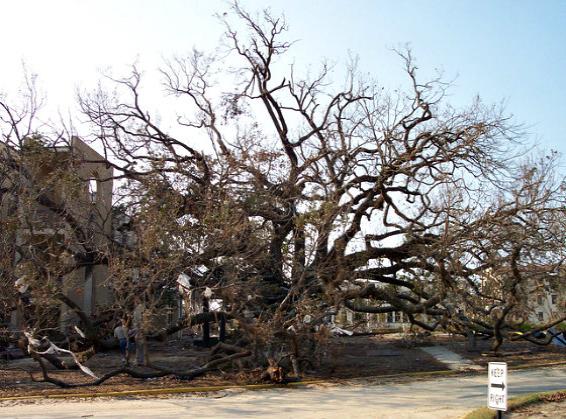 | Many venerable oaks on the Mississippi Coast were lost to Katrina, but the ancient Friendship Oak survived. It's located on the University of Southern Mississippi Gulf Park campus in Long Beach (pictured above days after the hurricane). A current photo is below. The inscription on its plaque reads: "I was a sapling when Columbus sailed and I was grown by Napoleon's reign. I am now over 500 years old. Those who enter my shadow are supposed to remain friends throughout their lifetime. There is not an alumna of the college who does not possess, tucked away in her treasures, a twig, a leaf or an acorn that came out of my heart." |