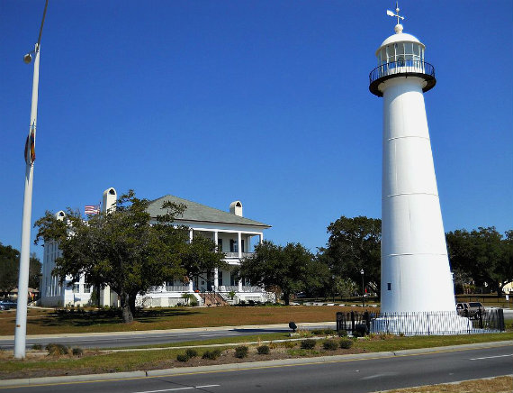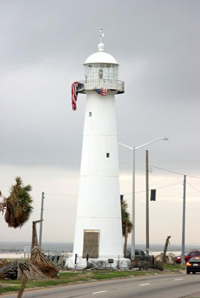 | Biloxi, MS lighthouse, constructed in 1848, is shown above, not long after Hurricane Katrina in 2005; below, a current photo, with the Lighthouse Park and Visitors Center complex visible in the background. The lighthouse was renovated in 2009 and the complex opened in 2011. |