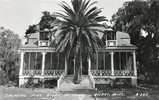 | This home in Biloxi, MS, was constructed in 1840 and became known as the Father Ryan house after the priest, who was a well-known poet, lived in the house in the 1870's. It was a popular photo opportunity for tourists who noticed the palm tree growing through the front steps. The photo on the postcard above was taken in 1912. |