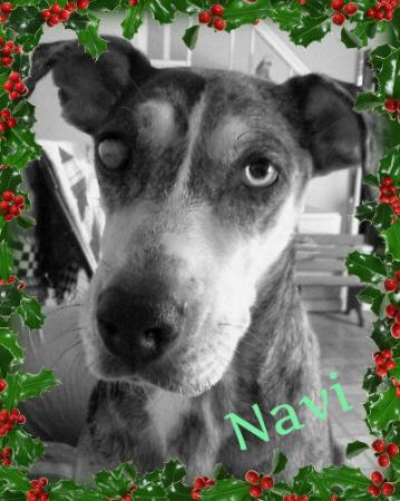 | Six and a half years ago, the dog I'd loved more dearly than any dog I'd ever had died just before his 16th birthday. I promised myself that I'd never get another dog, because I didn't want to go through the kind of pain his loss caused me again. I've held firm to that promise all this time. But, recently, my 13-year-old granddaughter, who volunteers at the SPCA, told me about a dog they were having trouble placing. It was a story that touched my heart. The dog had been picked up at the city dump, starving and with an injury to her face which eventually left her blind in one eye. That, combined with the fact that she'd had heartworms (which had been treated), seemed to put people off. She added that she hoped they could find a home for Navi (a name someone at the shelter had started calling her), because she was such a sweet dog that she deserved to have a family who loved her. But my granddaughter was beginning to think that wouldn't happen. I talked it over with my husband and the next day, I asked my son to go to the SPCA and adopt her. I told him that if Navi had already been adopted, to choose another dog they were having trouble placing, either because of age or physical handicap. (I couldn't bring myself to go, because I knew that if I went, the faces of the dogs I didn't adopt would haunt me for too long a time.) He came back with Navi. The original intent was to give her a chance at a happy life. But there's a funny thing about love. People who are prepared to give it, often find themselves receiving it. Navi is such a joy and she has brightened all of our lives. She has truly given us the gift of love. I wish you joy this holiday season. I wish you contentment and spiritual enrichment. I wish you happy moments with those you hold dear. I hope that all of your Christmas wishes come true. But, most of all, I wish you love. -- Nancy |