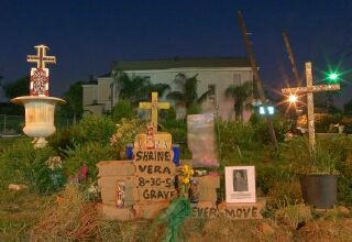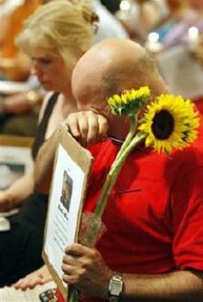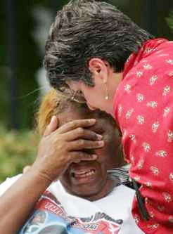 Left, one New Orleanian comforts another at a memorial service. Right, a man weeps at a memorial service for pets.