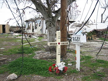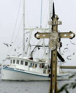 A shrimp boat passes the cross memorial to those killed in St. Bernard Parish when the levees failed.