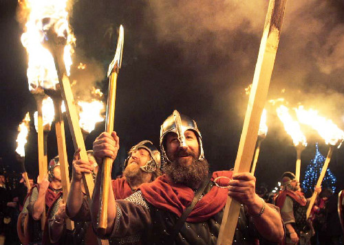 | Edinburgh's torchlight procession, with participants dressed as Vikings One of the strongest influences on Hogmanay comes from the ancient Norse winter festival of Yule. |