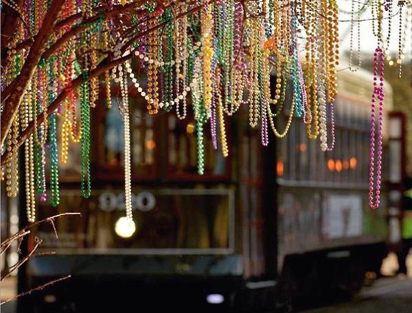 | Beads thrown during a parade the previous day hang on trees & electric wires on St. Charles Avenue. |