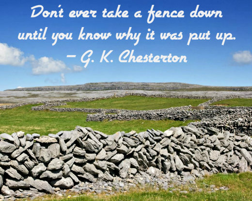 | I see him there, grasping a stone in each hand, Like an old-stone savage armed. He moves in darkness as it seems to me -- Not of woods only and the shade of trees. He will not go behind his father's saying, And he likes having thought of it so well He says it again: "Good fences make good neighbors." -- Robert Frost |