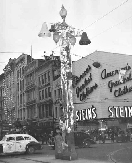 | From right to left, Stein's clothing store, White Brothers Jewelers, Hausmann's Jewelers, Adler Jewelers |