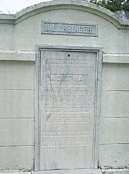 | Erzinger - Cosgrove tomb in Lafayette Cemetery where Lena Cosgrove is buried; James Cosgrove is buried in the CSA Army of Tennessee tomb in Metairie Cemetery. |