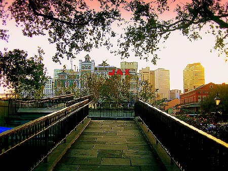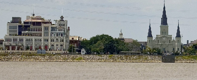 | The Jax Brewery Shopping Mall today, with Jackson Square and St. Louis Cathedral to the right. |