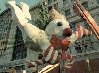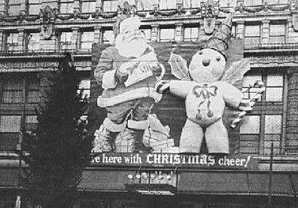 | Although, with his holly wings, Mr. Bingle could fly, he needed a little help from a crane to situate himself just so on the MB building every year. With thanks to Hazel Currera for this photo, taken from a Time-Picayune clipping. |