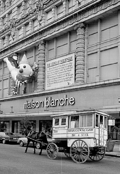 | "Jingle, jangle, jingle, here comes Mr. Bingle With another message from Kris Kringle. Time to launch the Christmas season, Maison Blanche makes Christmas pleasin', Gifts galore for you to see...each a gem from MB." |