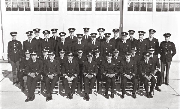 | Members of the Naval Air Station Staff: Michael's father, Bob Cosgrove is 8th from left, in the first standing row; next to him, 7th from left, is Winston Walker; #1 in the last row is William Grieve; 1941. ~ ~ ~ The city donated 182 acres along the shore of Lake Pontchartrain and, in 1941, the New Orleans Naval Air Reserve Base was commissioned. The base was rededicated as a Naval Air Station in 1943. Eventually, as jets came on the scene, the short runways at the NAS became a problem. Also, due to heavy residential growth in the area, the city had begun to close in around the station; and the University of New Orleans was building "next door" to the base. For those reasons, it was decommissioned in 1957 and New Orleans Air Station Joint Reserve Base, Alvin Callender Field, located across the river in Belle Chasse, was commissioned in 1958. The UNO campus has taken in all of the area which used to be occupied by the Naval Air Station. |