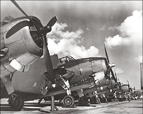 | TBM aircraft at Naval Air Station; the smokestack, in the distance, to the right, is the only thing that currently remains of the NAS, it now stands on UNO's campus. |
