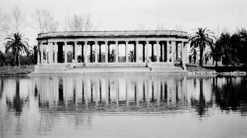 | Constructed in 1907, the Neo-Classical Peristyle in City Park is one of the park's oldest and most recognizable structures. It was originally designed as a dance pavillion. Four magnificent concrete lions guard the Peristyle next to steps leading down to the edge of Bayou Metairie. Ducks, geese and swans swim by during the day and, at night, the lights of the Peristyle are dramatically reflected on the Bayou. The photo above was taken in 1929. -- Nancy |