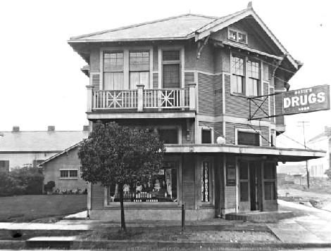 | Drugstore at St. Bernard and N. Broad Avenues at Castiglione Street (the 3 streets come to a triangle here), 1929 |