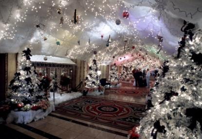 | During the holiday season, the block-long lobby of The Roosevelt Hotel turned into a Christmas wonderland. The tradition of decorating the lobby in a canopy of angel hair was started in 1930.. Eleven tons of angel hair and 100,000 lights were used. For generations of New Orleanians,the lobby was a must-see during the holidays. The historic hotel was damaged in the levee failures in 2005 and sat empty for 4 years. But, it re-opened in July, 2009, and this year, we can once again see The Roosevelt's holiday display. See the Roosevelt Christmas page. |