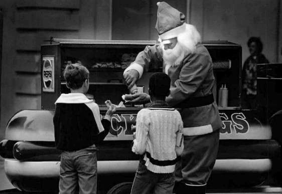 | In most places, Santa hands out candy canes. In New Orleans, he hands out hot dogs from the Lucky Dog cart in the French Quarter; 1970. |