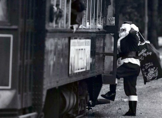 | In most places, Santa's preferred mode of transportation around town is a sleigh. In New Orleans, he catches a ride on the streetcar; 1970. |