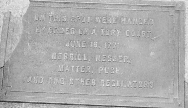 | "On this spot were hanged, by order of a Tory Court, June 19, 1771, Merrill, Messer, Matter, Pugh, and two other Regulators" |
