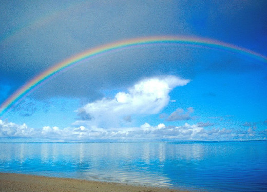 | This rainbow was removed from its rightful place in a photo taken of mountains in the Grand Canyon and given a new home over this tranquil lake a thousand miles away. |