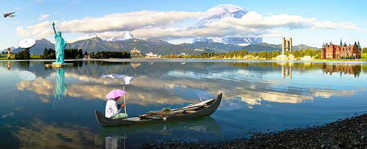 | This is a composite of 16 different photos (taken in 13 different countries) that have been digitally manipulated to make it look as if the Statue of Liberty, the Sydney Opera House, a castle in Denmark and several other world landmarks share the same landscape. To see the pictures that make up this montage, click here. |