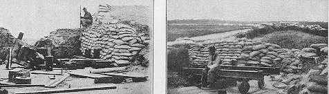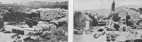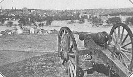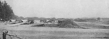 The unfinished redoubt. Here we see the inside of the redoubt at the left background of the picture above. The scene is just before the battle and picks and shovels were still busy throwing up the embankments to strengthen the center of the Federal defense. Casey's artillery was being hurriedly brought up. In the background General Sickles' Brigade appears drawn up in line of battle. When the Confederates first advanced, Casey's artillery did telling work, handsomely repelling the attack early in the afternoon of May 31st. Later in the day, Confederate sharp-shooters from vantage points in neighboring trees began to pick off the officers and the gunners and the redoubt had to be relinquished. The abandoned guns were turned against the retreating Federals. |