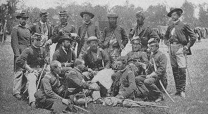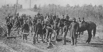 "Regulars" near Fair Oaks, officers of McClellan's Horse Artillery Brigade. These trained soldiers lived up to the promise in their firm-set features. Major Hays and five of his Lieutenants and Captains here, Pennington, Tidball, Hains, Robertson and Barlow had, by 1865, become general officers. From left to right (standing) are Edward Pendleton, A. C. M. Pennington, Henry Benson, H. M. Gibson, J. M. Wilson, J. C. Tidball, W. N. Dennison; (sitting) P. C. Hains, H. C. Gibson, William Hays, J. M. Robertson, J. W. Barlow; (on ground) R. H. Chapin, Robert Clarke, A. C. Vincent. |