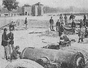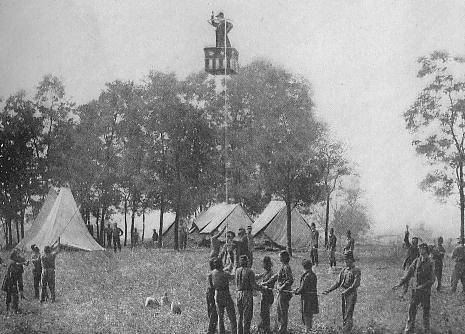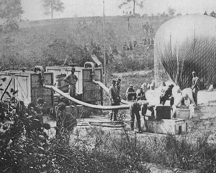 The photograph the balloonist recognized forty-eight years after. "When I saw the photograph showing my inflation of the balloon Intrepid to reconnoiter the battle of Fair Oaks," wrote Professor T. S. C. Lowe in the American review of Reviews for February, 1911, "it surprised me very much indeed. Anyone examining the picture will see my hand at the extreme right, resting on the network, where I was measuring the amount of gas already in the balloon, preparatory to completing the inflation from gas in the smaller balloon in order that I might ascent to a greater height. This I did within a space of five minutes, saving a whole hour aaat the most vital point of the battle." It truly is remarkable that Professor Lowe should have seen and recognized, nearly half a century afterward, this photograph taken at one of the most critical moments of his life. |