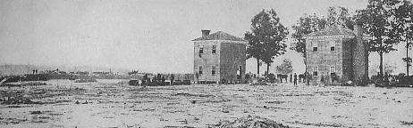 The slaughter field at Fair Oaks. Over this ground the fiercest fighting of the two days' battle took place, on May 31, 1862. Some 400 soldiers were buried here, where they fell, and their hastily dug graves appear plainly in the picture. In the redoubt seen just beyond the two houses was the center of the Federal line of battle, equi-distant, about a mile and a half, from both Seven Pines and Fair Oaks. The entrenchments near these farm dwellings were begun on May 28th by Casey's Division, 4th Corps. There was not time to finish them before the Confederate attack opened the battle, and the artillery of Casey's Division was hurriedly placed in position behind the incomplete works. |
