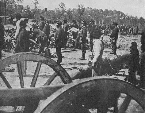 Aiming the guns at Fair Oaks. Here we see the beginning of the lull in the fighting of the second day at Fair Oaks, which it has been asserted led to a fatal delay and the ruin of McClellan's Peninsula Campaign. The first day's battle at Fair Oaks, May 31, 1862, was decidedly a Federal reverse which would have developed into a rout had not Sumner, crossing his troops on the perilous Grapevine Bridge, come up in time to rally the retreating men. Here we see some of them within the entrenchments at Fair Oaks Station on the Richmond and York River Railroad. The order will soon come to cease firing at the end of the second day's fighting, the result of which was to drive the Confederates back to Richmond. McClellan did not pursue. The heavy rainstorm on the night of May 30th had made the movement of artillery extremely difficult, and McClellan waited to complete the bridges and build entrenchments before advancing. This delay gave the Confederates time to reorganize their forces and place them under the new commander, Robert E. Lee, who, while McClellan lay inactive, effected a junction with "Stonewall" Jackson. |
