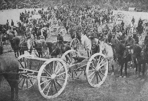 "Flying Artillery" in the attempt on Richmond. The cannoneers who kept up with the cavalry, in this swiftest branch of the service each man rides horseback. Here are drawn up Harry Benson's Battery A, of the Second United States Artillery, and Haratio Gates GIbson's Batteries C and G, combined of the Third United States Artillery, near Fair Oaks, Virginia. They arrived just a short time too late to participate in the battle. They were in Yorktown and the Seven Days. |