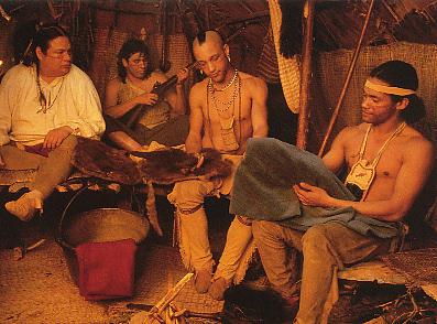 Wampanoags gather in a wetu, Hobbamock's homesite is one of the exhibits. |